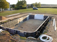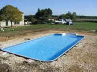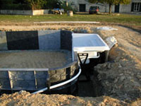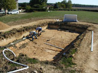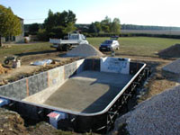 Stage six: An underfelt is glued to the concrete, the liner is then installed and the pool filled with water, the overdig is now backfilled with stone. The pool is now fully functional and ready for terracing.